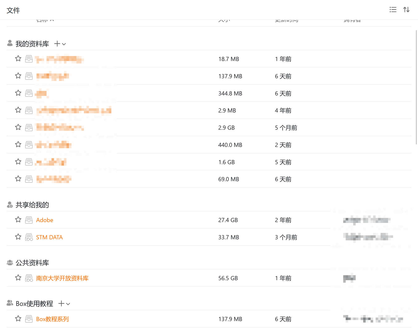 - 群组(双人图标):(图中“Box使用教程”以及以后的部分)以建群方式进行共享的各个群组